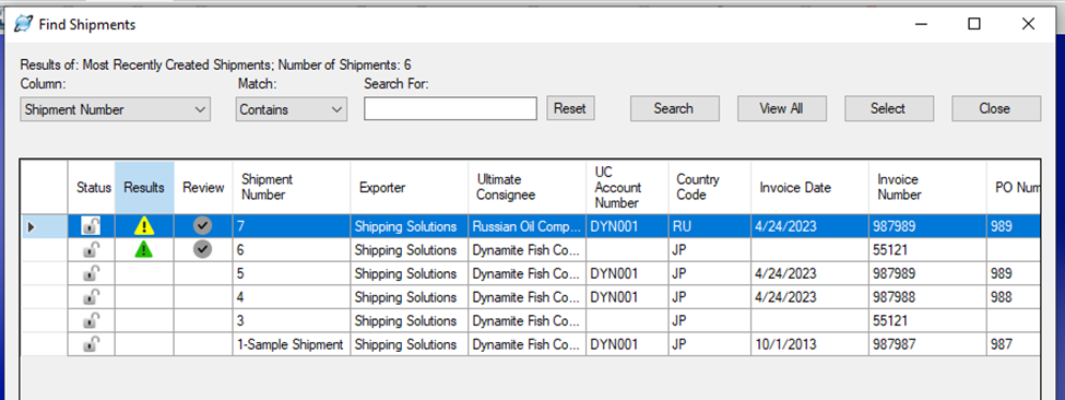 When you go to the EZ Start tab and click Find or Select Shipment. You will now see the two new columns: Results and Review. These columns will be blank for shipments with screenings run prior to upgrading to 9.18. Only the results and review status from the most recent Restricted Party Screening for that shipment will display.