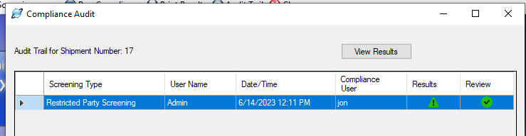 To review the results again, select a shipment and then click the Compliance button. Click Audit Trail. You will see the list of screenings run for this shipment from newest to oldest along with their Results and Review statuses. Select a screening and then click View Results to see the results of that screening. You can then change the Results status if needed.