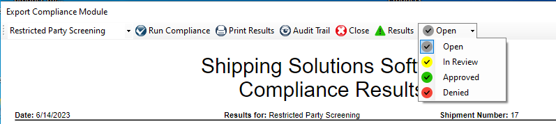 Shipping Solutions Professional and Shipping Solutions Enterprise Version 9.18 upgrades the Export Compliance Module by giving users a Results indicator and Review status on the compliance results, Compliance Audit Trail, and Find Shipments screens.
