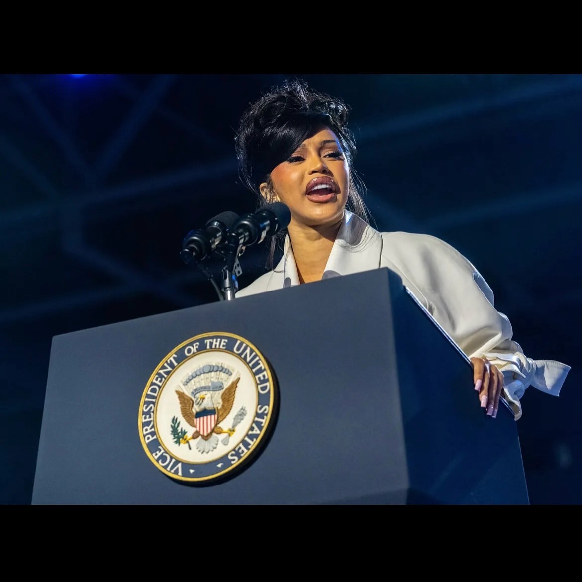 Cardi B spoke at a Kamala Harris rally in Milwaukee wearing a suit by Kristina Fidelskaya and Christian Louboutin pumps, styled by Kollin Carter .