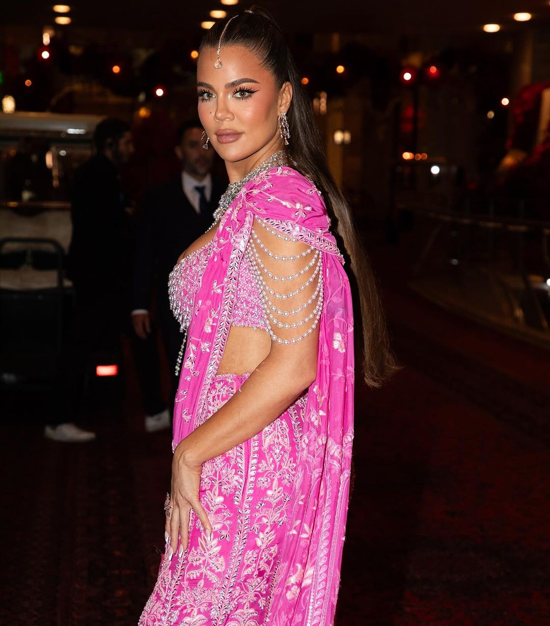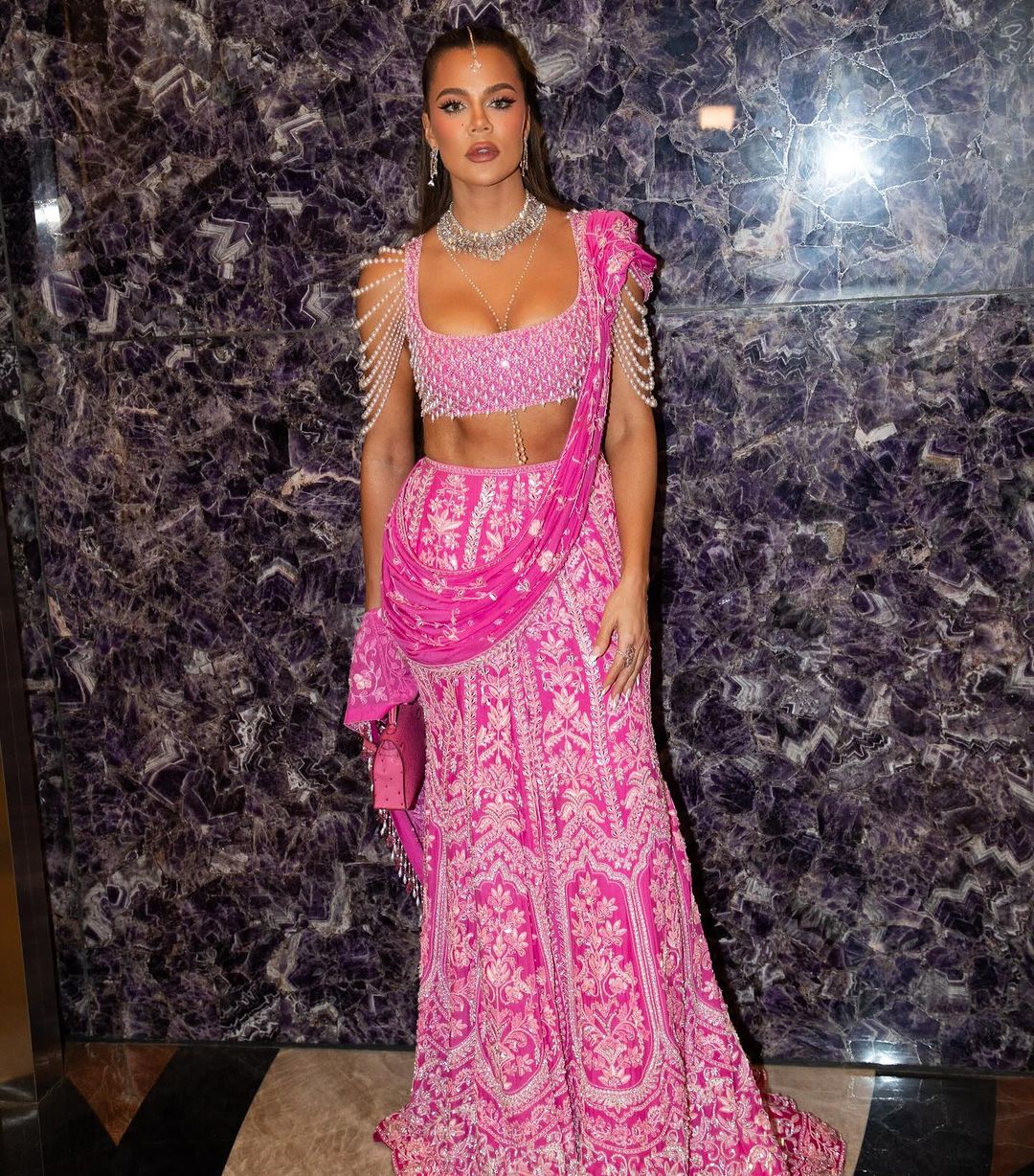Country to her sister’s Ivory palette, Khloe Kardashian looked pretty in pink. The ‘Good American’ founder, who is aging like fine wine, glistened in a rose pink chiffon saree for her first visit to India.