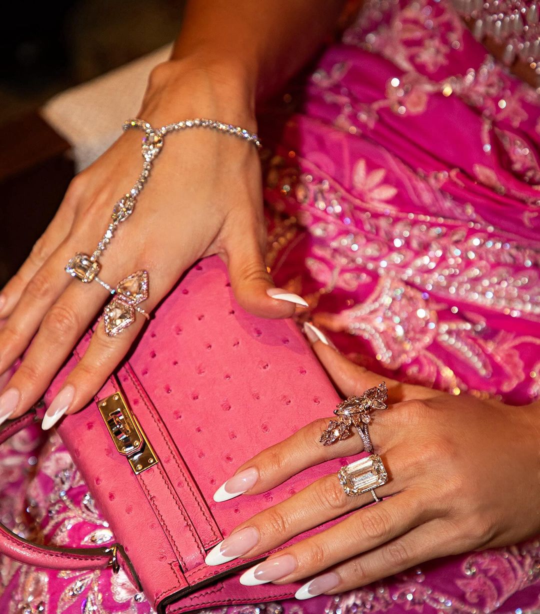 Her wrist and fingers were dripping in diamond jewels that stood out against her pink mini Hermes Kelly handbag.