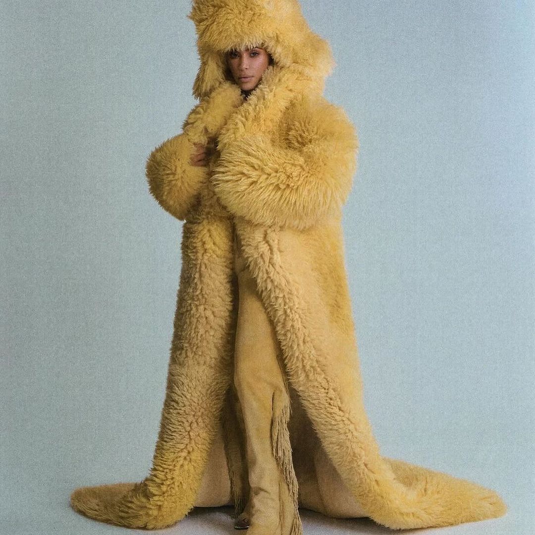 The designer Eli Russell Linnetz wanted to showcase his love for California in his FW24 collection entitled, “Made in California,” which features a variety of canary yellow shearling pieces worn by the mother and daughter duo.