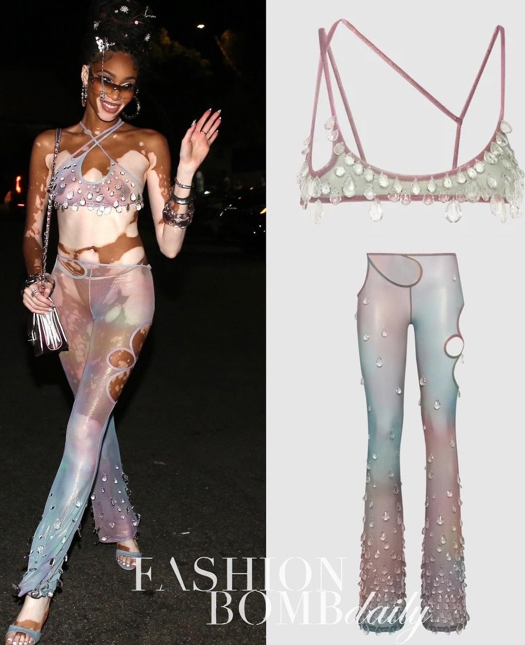 Talk about beauty, and if anyone could pull off this sheer ensemble, it was certainly Harlow who accessorized with two-tone shades, hoop earrings and bangles.