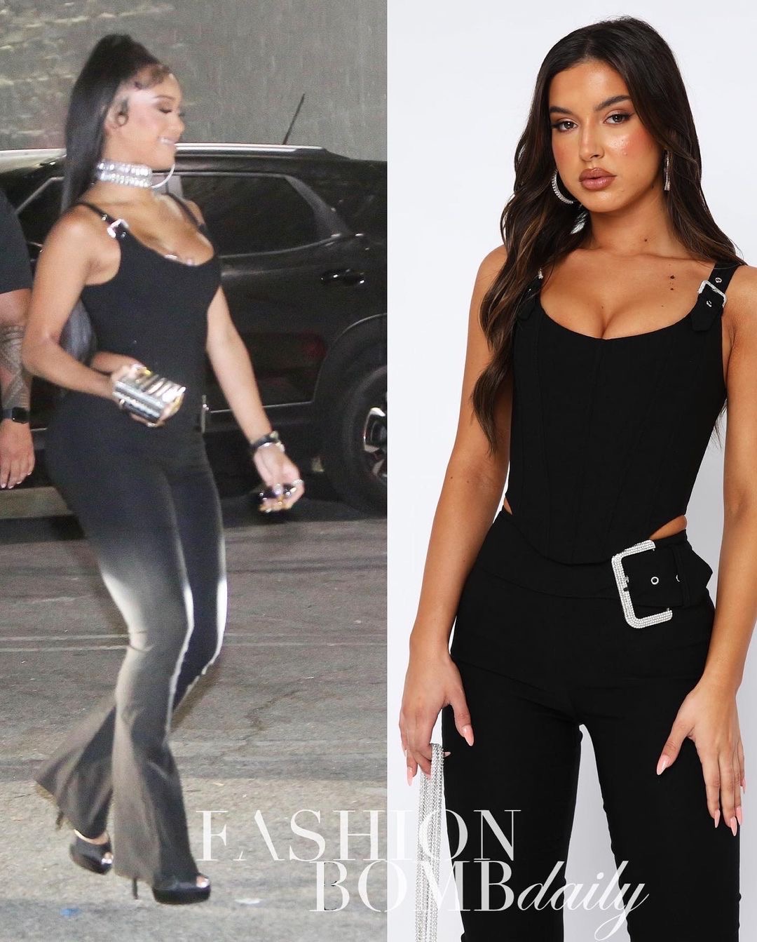 Saweetie who’s been recently spotted with YG all around Los Angeles kept things simple in all black with a corset and flare pants from White Fox boutique that she styled with a black open-toe platform and diamond choker necklace.